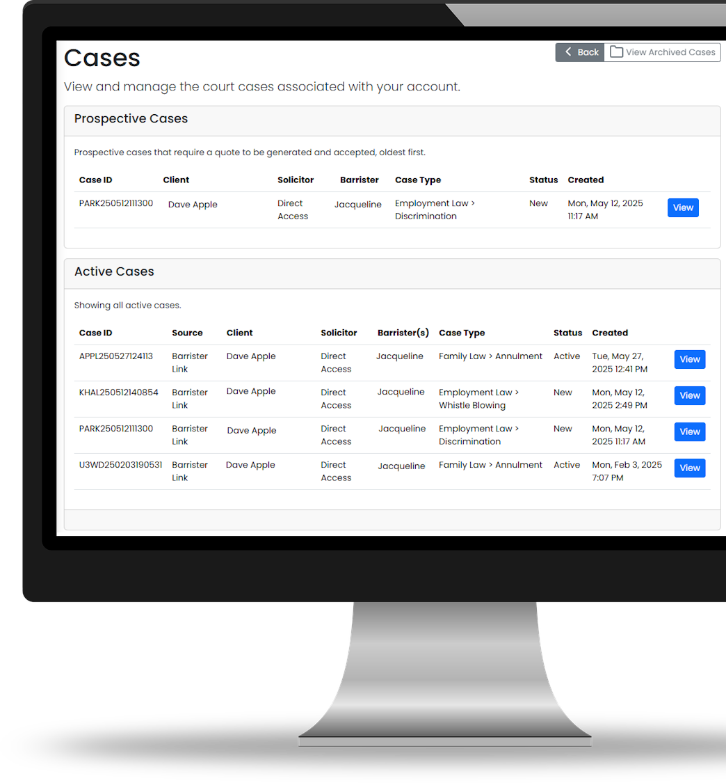 Chambers Link is packed full of tools to reduce the administrative load. Diary management, calendar syncing, bundle creation and a full case, hearing and contact management system are all included. Our system allows you to request documents and info from clients at the click of a button. We know that your time is the most valuable commodity you have, and we help you make the most of it.